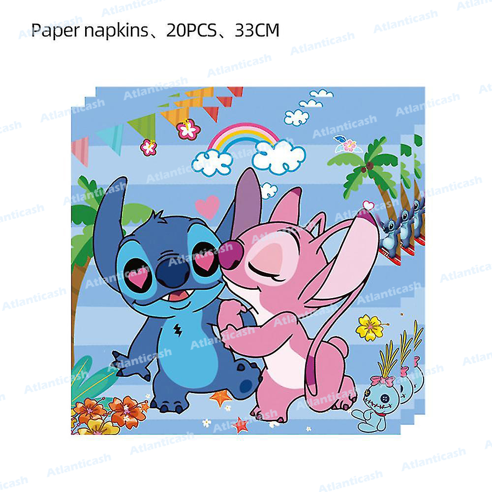 Conjunto de 20 guardanapos do Stitch e da Angel da Disney para decorar a tua festa de aniversário com o mesmo tema.