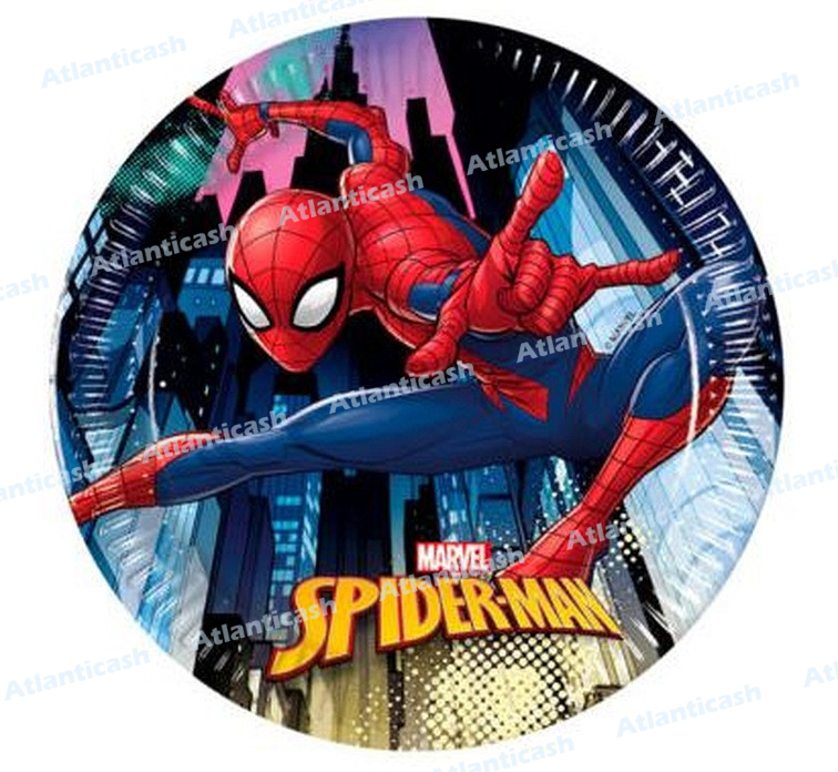 Conjunto de 8 pratos descartáveis da coleção Team Up Homem-Aranha para decoração e utilização na tua festa de aniversário.