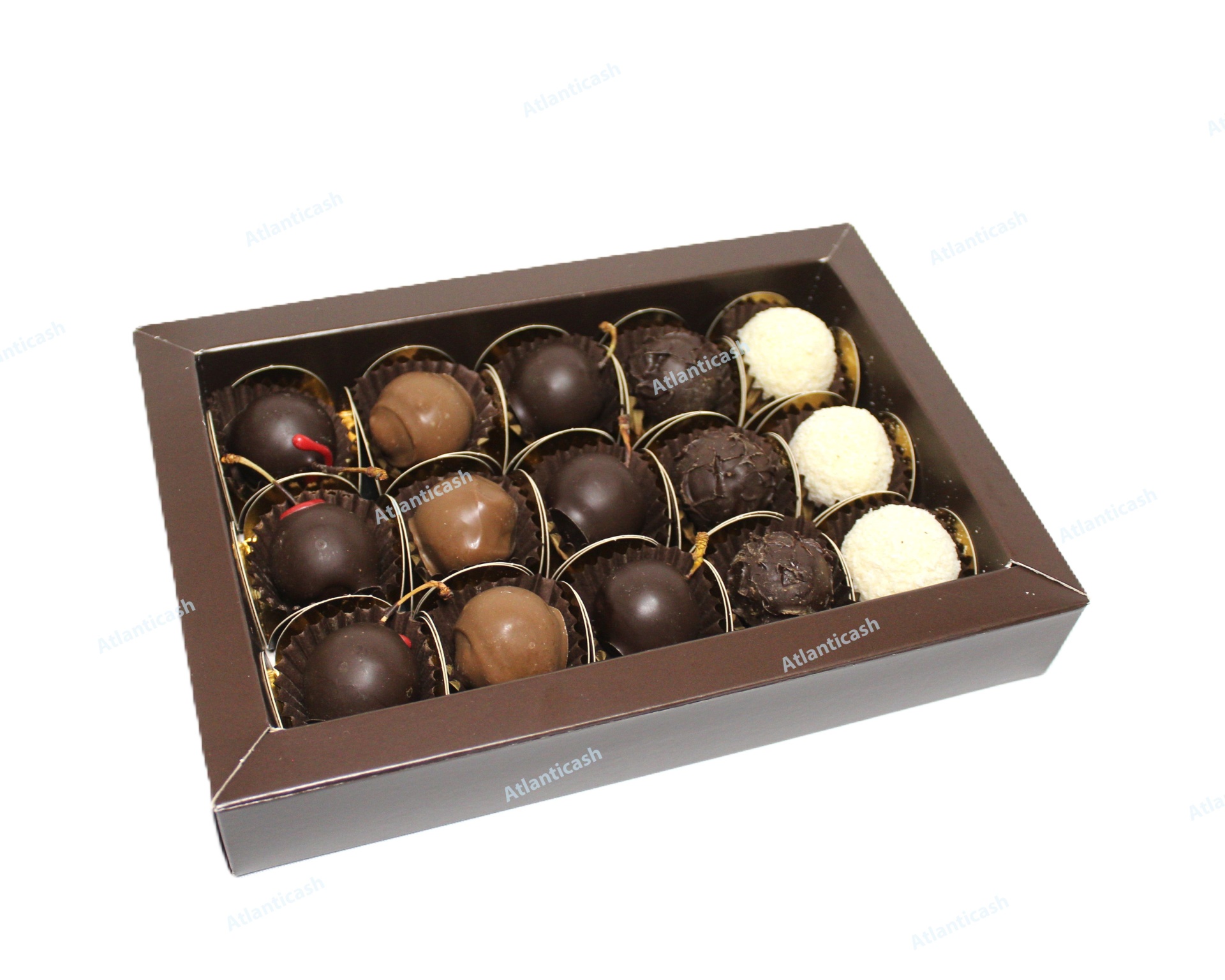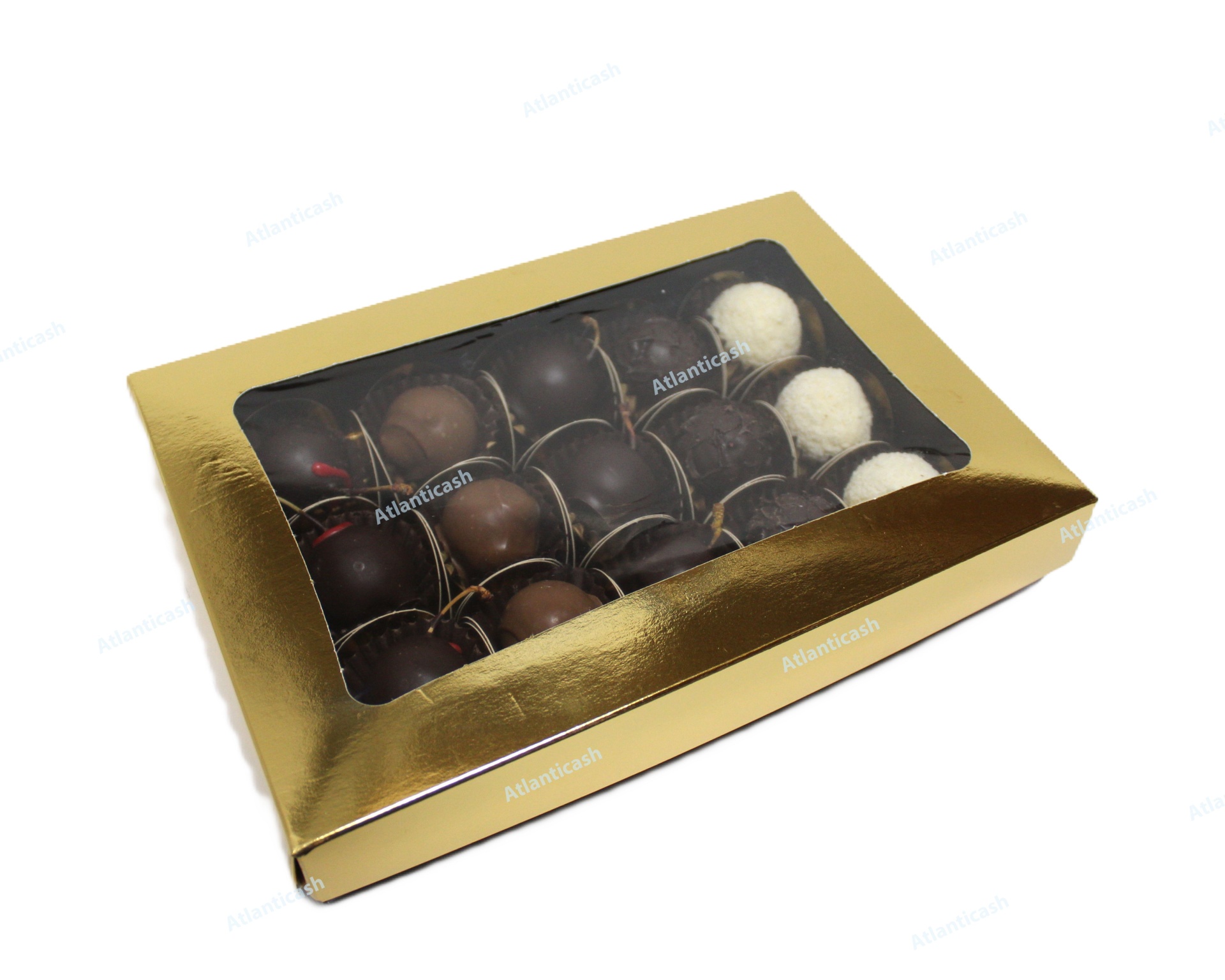 Caixa com janela. Medidas: 21,5X14,5X3,5cm. A caixa vem com tampa e com fundo na cor dourada ATENÇÃO: Após a montagem da embalagem, a sua área útil possui as seguintes dimensões: 18.5x11.5x3.5cm (notar que as laterais têm uma espessura de aproximadamente 1.5cm). Ideal para embalamento de bombons e brigadeiros. Ideal para o Natal