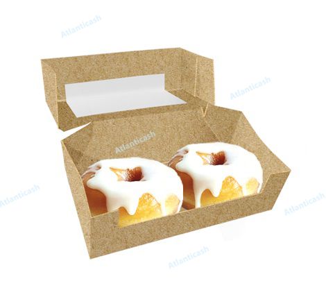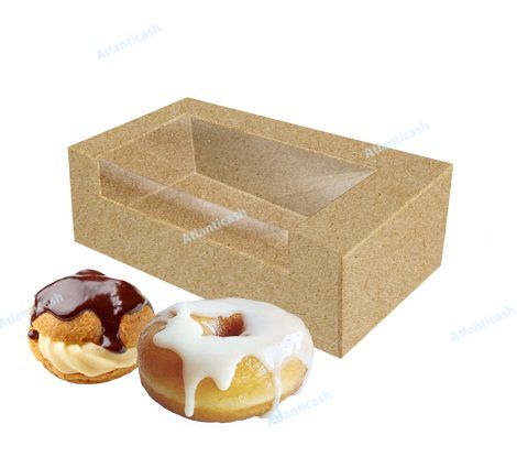 Embalagem em cartolina com janela para dois donuts ou 3 mini ovos. Caixa laminada com plastico para uma melhor resistencia à gordura. Medidas: 20,5X10X6 cm. Ideal para o verão, praia, take away.