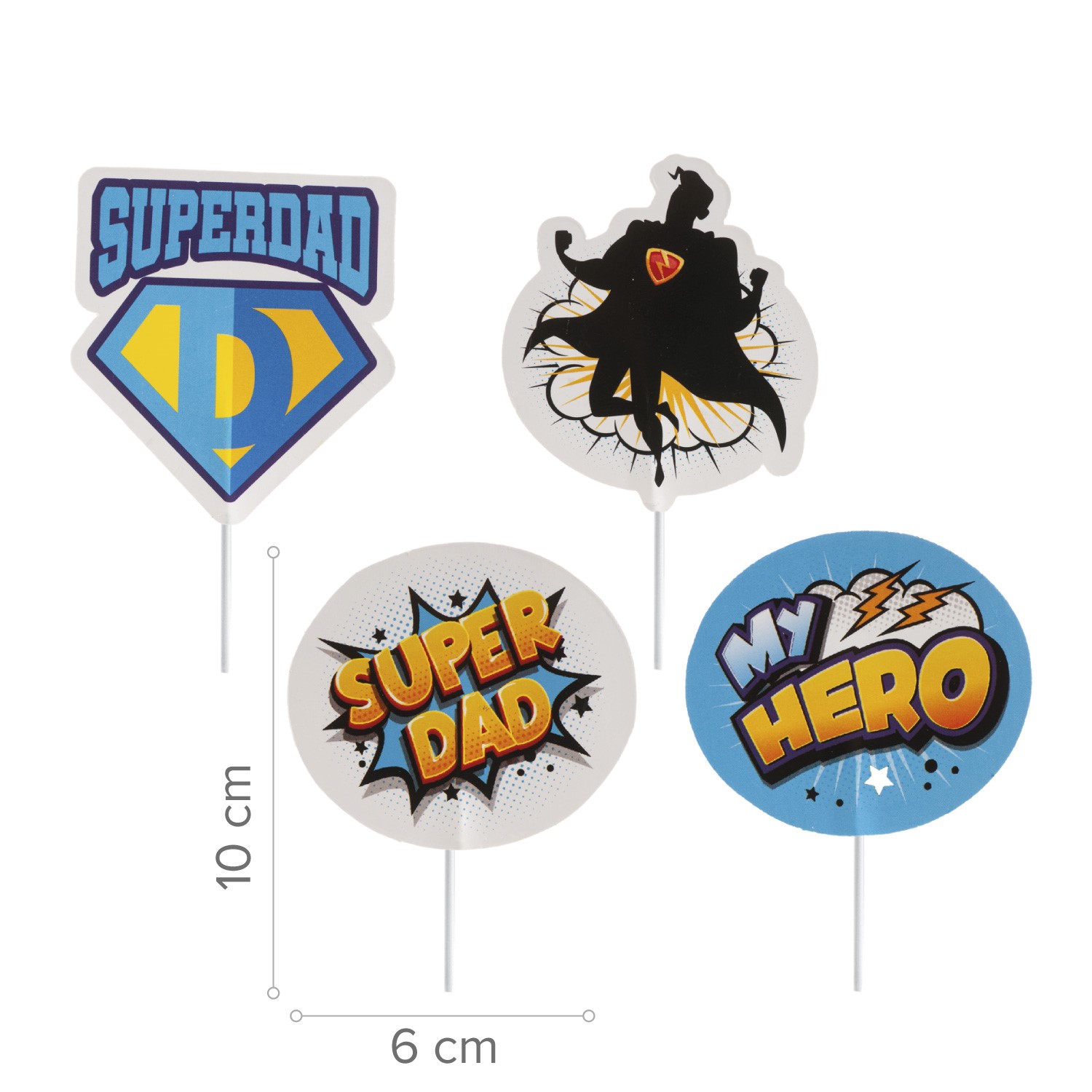 Marca: Dekora Tema: Super Dad / Super Pai Material: Papel Quantidade: 8 cake toppers 4 modelos diferentes Fáceis de usar, prontos a colocar Ideais para bolos, cupcakes e outras sobremesas Uma forma simples e criativa de homenagear um verdadeiro super pai 💙