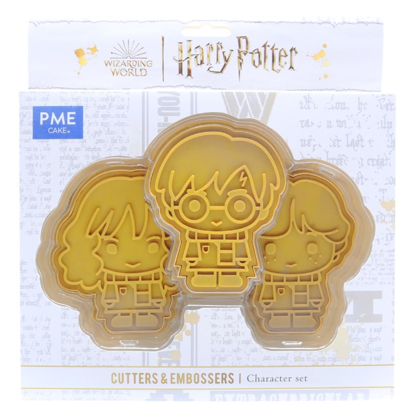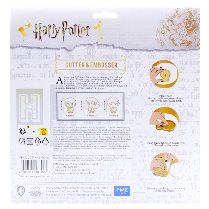 Harry Potter Cookie Cutter & Embosser, Conjunto de 3, Harry, Rony & Hermione Use o cortador e o embosser de Harry Potter para criar os icônicos personagens Harry, Rony e Hermione em seus biscoitos ou decorações de fondant O conjunto inclui 3 cortadores e 3 relevos feitos de plástico PET seguro para alimentos. Harry 85 x 105 x 15mm; Hermione 105 x 110 x 15mm; Rony 105 x 95 x 15mm Basta estender sua massa ou fondant, pressionar o cortador para baixo para fazer o contorno da forma e, em seguida, pressionar o embosser para adicionar seus detalhes Melhore seus recortes pintando com corantes alimentícios comestíveis ou canetas comestíveis, ou adicione um toque de 3D colocando detalhes de fondant em camadas Exclusiva da PME, esta coleção Harry Potter oficialmente licenciada também inclui estojos de cupcakes, toppers, sprinkles, gravadores, decorações de açúcar, moldes de chocolate, assadeiras e muito mais