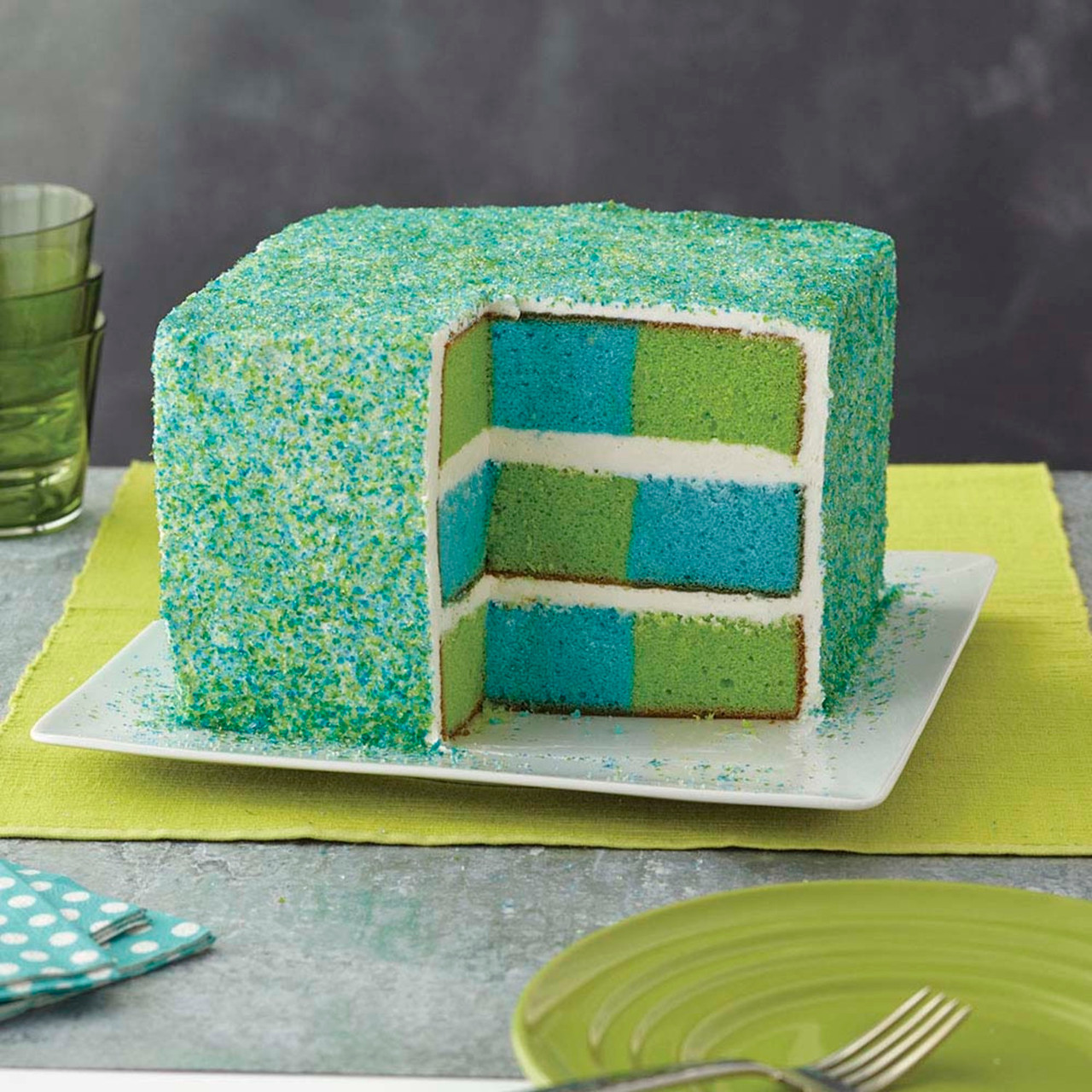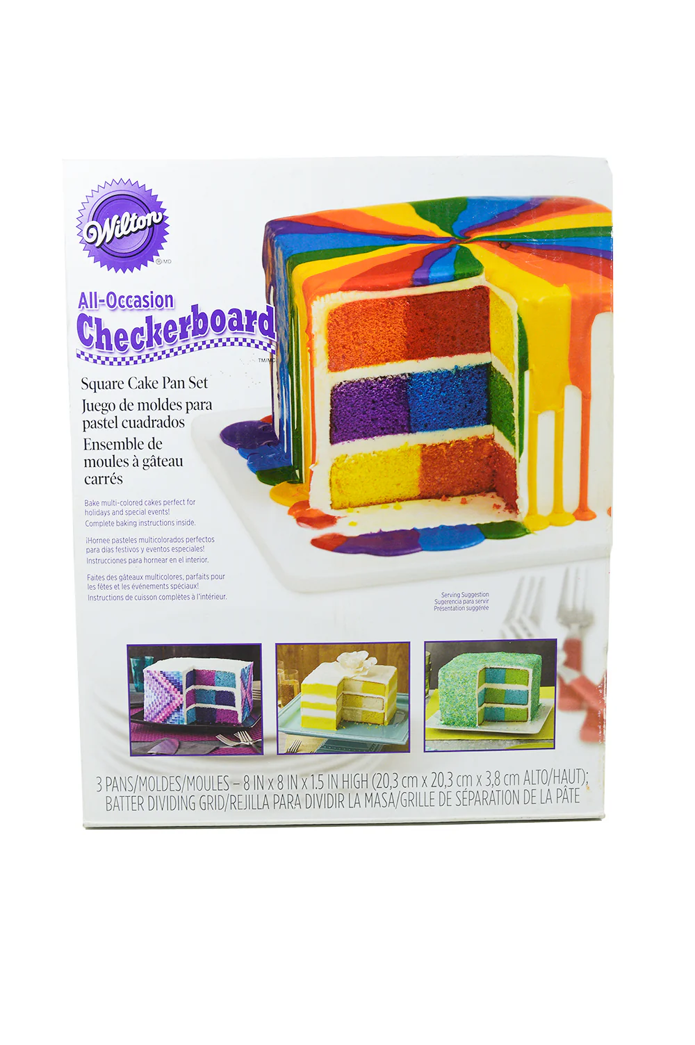 Utilize o conjunto de formas de bolo quadrangular para cozer camadas de bolo multicoloridas.