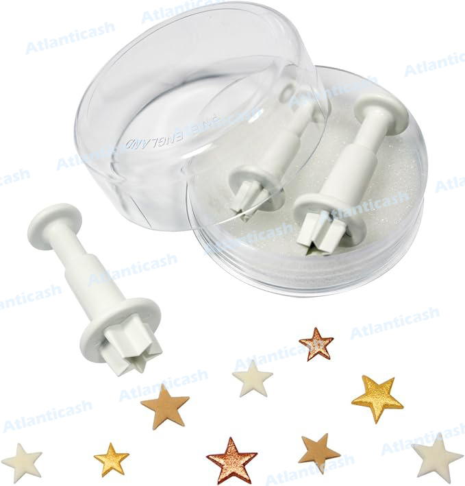 Cortador para biscoitos STAR Molde com pistão para cortes precisos Conjunto de 3 peças em formatos pequenos: Dimensões: 1cm, 1,5cm e 3,0cm Altura do pistão: 4 cm Uso: massa de açúcar, esmalte alimentar, maçapão massa crua Modo de usar: estenda a massa ou massa de açúcar até a espessura desejada, coloque a forma e pressione o êmbolo Material: plástico forte a cor branca Embalagem: blister