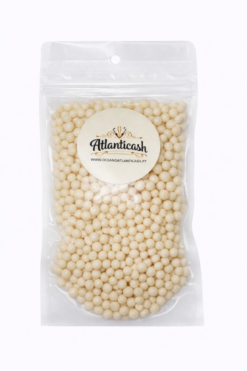 Pequenas bolas de cereais revestidas de chocolate branco puro.