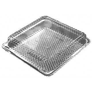 Embalagem quadrada plástico transparente com tampa articulada.
