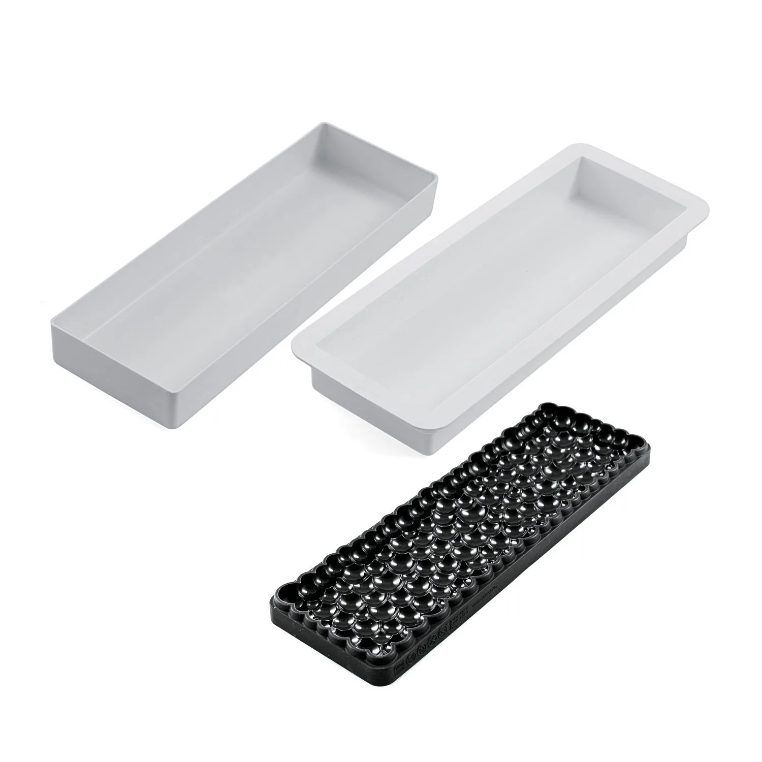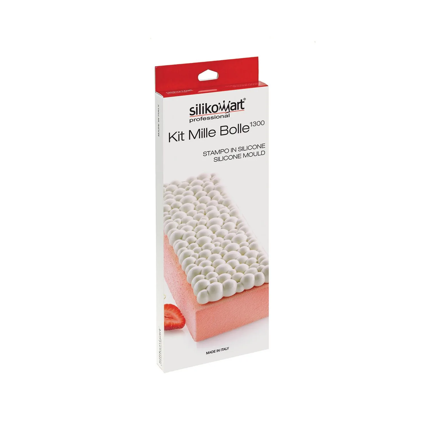 Descrição Todos os sentidos serão agradavelmente estimulados por uma textura suave, pronta a ser saboreada. O Kit Mille Bolle1300 da Silikomart Professional é composto por três elementos: um molde em silicone para criar uma preparação com um volume de 1300 ml, um suporte em plástico para garantir maior estabilidade e facilidade de uso, e um tapete em silicone com um padrão original de bolhas. Uma forma simples e inovadora de criar sobremesas sofisticadas e leves como uma bolha.