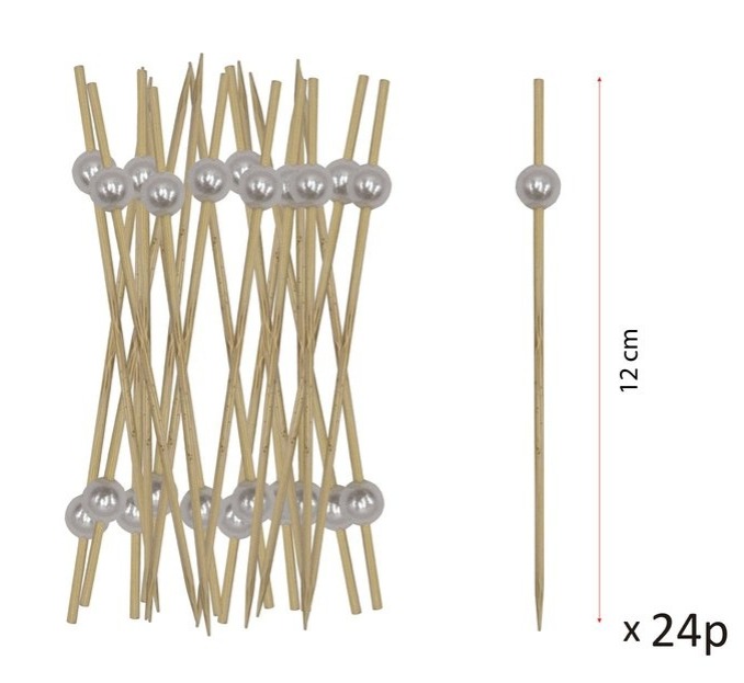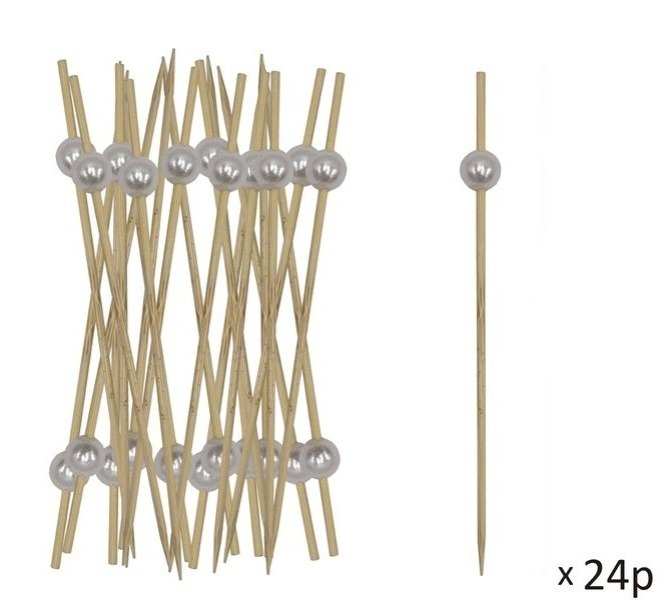 Pacote de 24 espetos de madeira de bambu com cabo e uma perola. Ideal para apresentar alimentos de qualidade premium, com acabamento liso e sem lascas. Ideal para utilização em catering, degustações, festas ou todo o tipo de eventos. Oferece resistência, flexibilidade e um design elegante e simples para decorar suas refeições. São também 100% recicláveis, compostáveis e biodegradáveis.