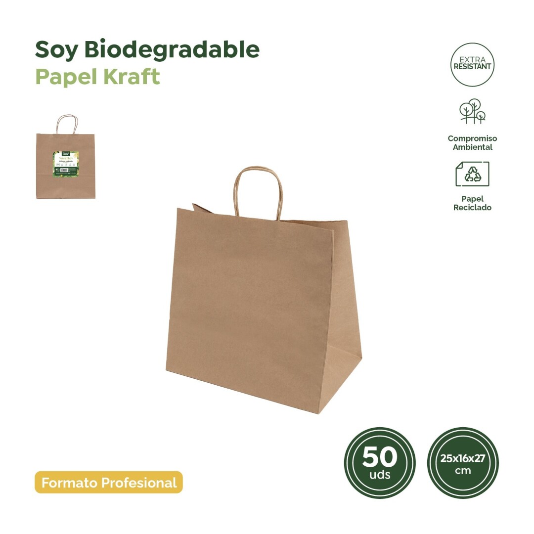 Dimensões: 25x16x27 cm; Material biodegradável: Papel kraft 100% sustentável; Versatilidade: Adequado para comércio ou uso pessoal; Compromisso ambiental: Contribui para a redução do impacto ambiental.