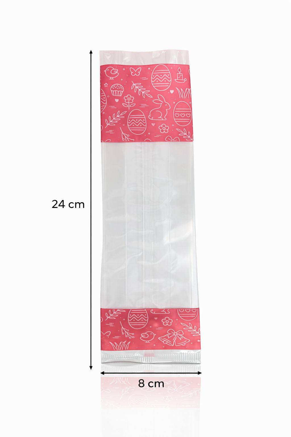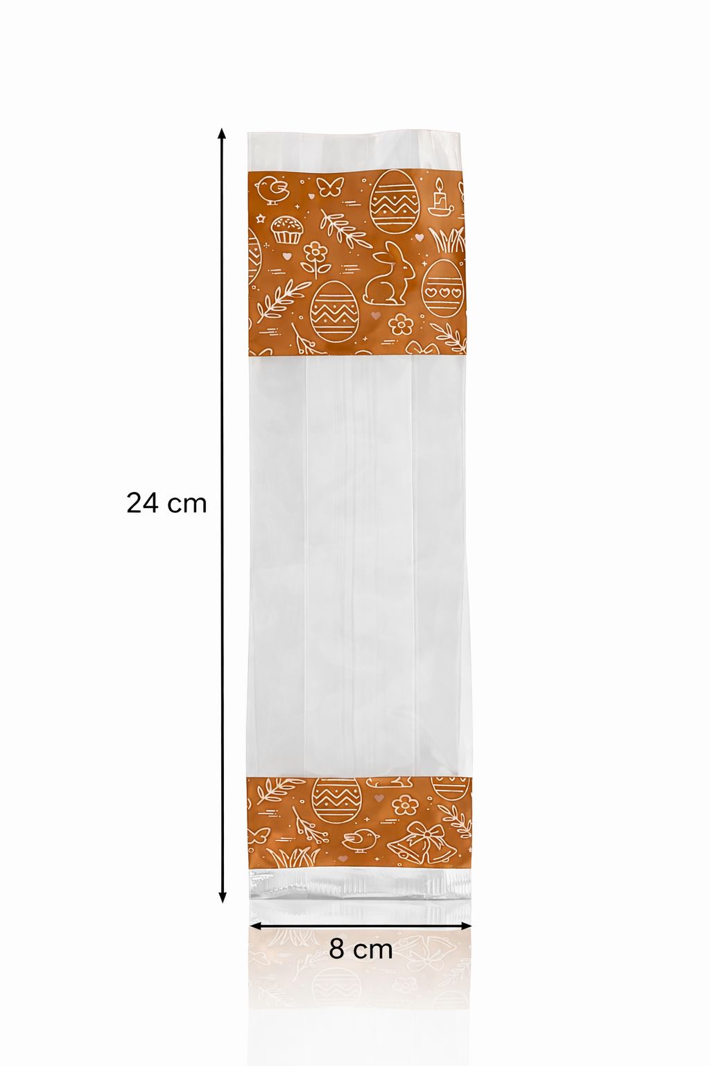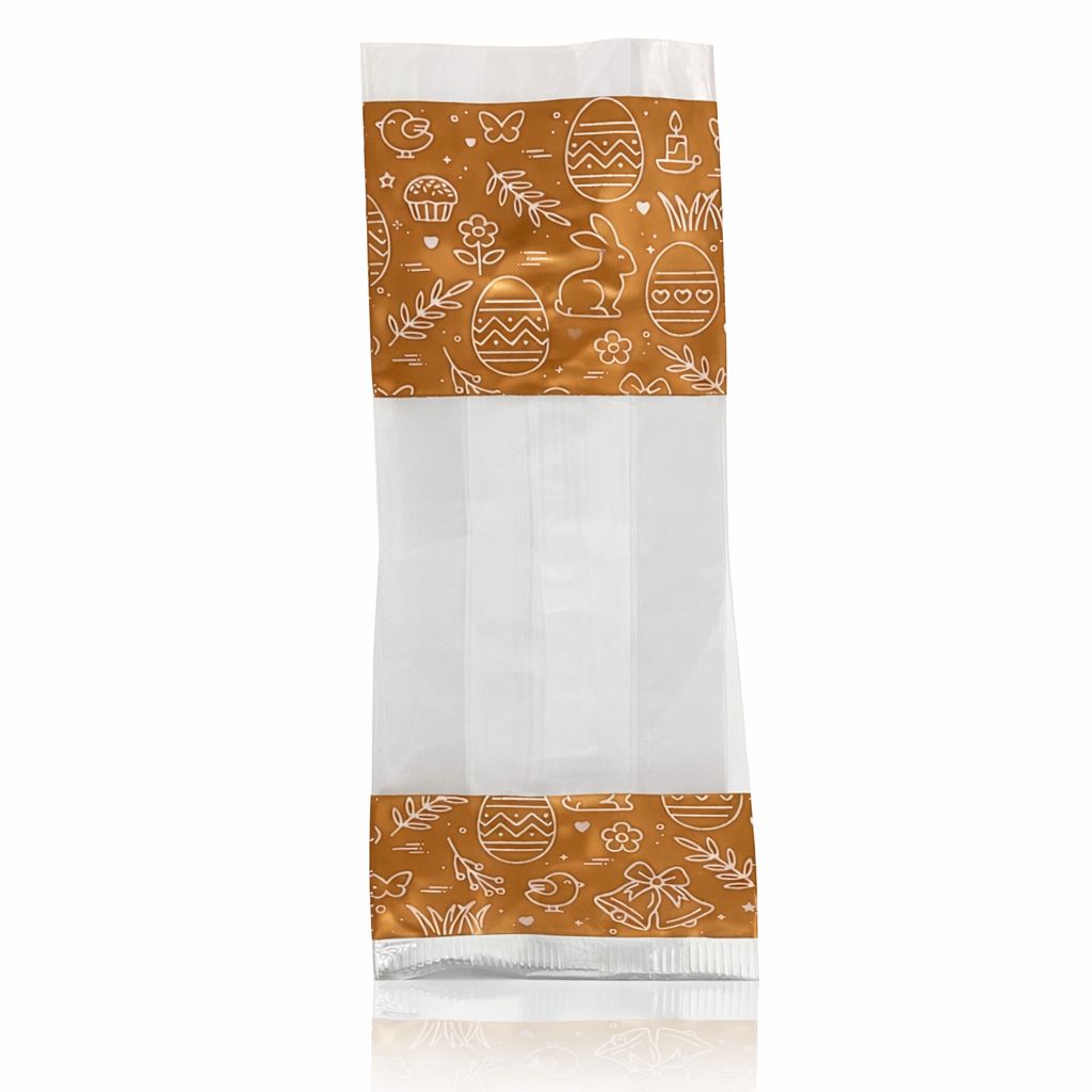 Saco Transparente Decorado Páscoa 24x8 cm Saco transparente com decoração temática de Páscoa, ideal para embalar amêndoas, chocolates, bolachas, gomas ou pequenos presentes.
