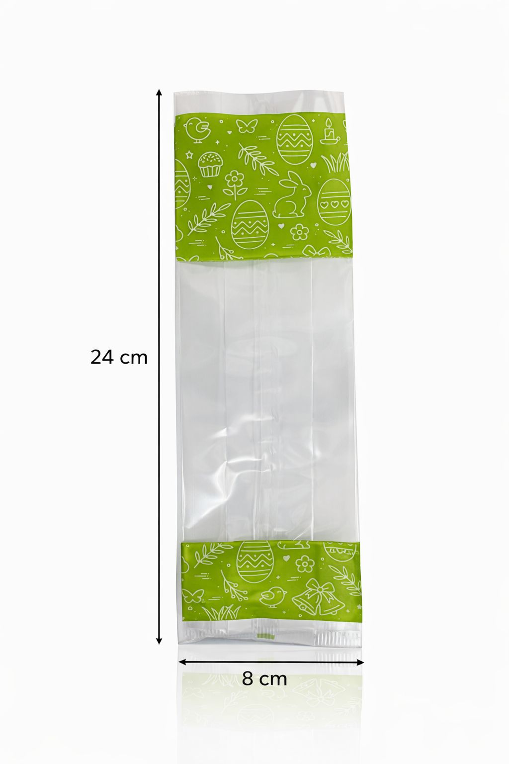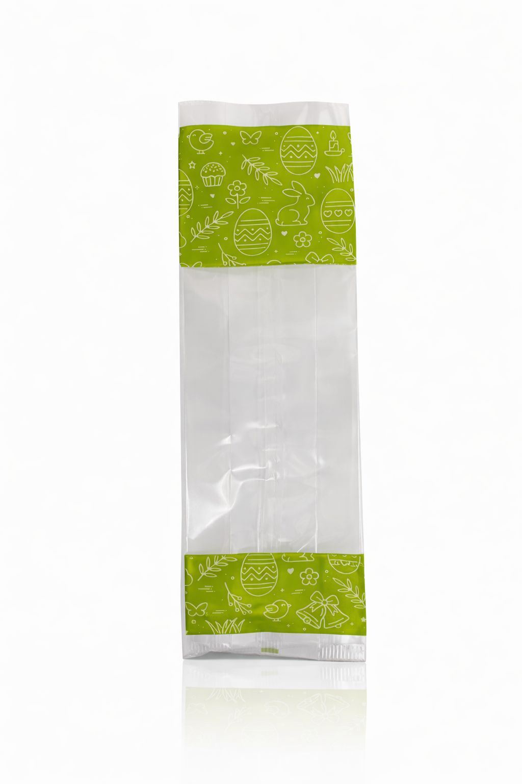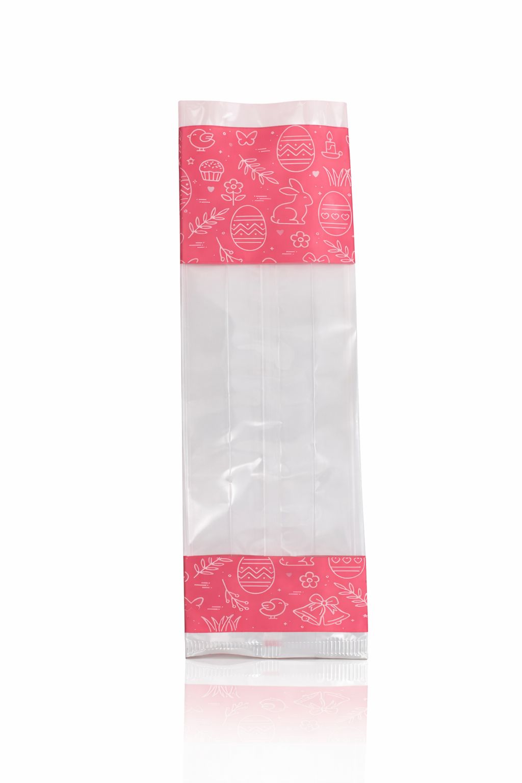 Saco Transparente Decorado Páscoa 24x8 cm Saco transparente com decoração temática de Páscoa, ideal para embalar amêndoas, chocolates, bolachas, gomas ou pequenos presentes.