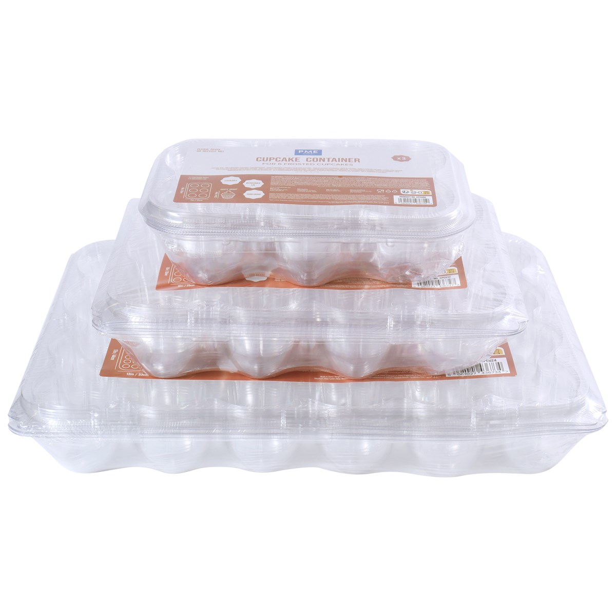 Escolha entre recipientes para cupcakes de 6, 12 ou 24 unidades. Explore a linha de cartões para bolos, tábuas e caixas da PME; disponíveis em vários tamanhos para transportar e exibir suas criações com estilo.