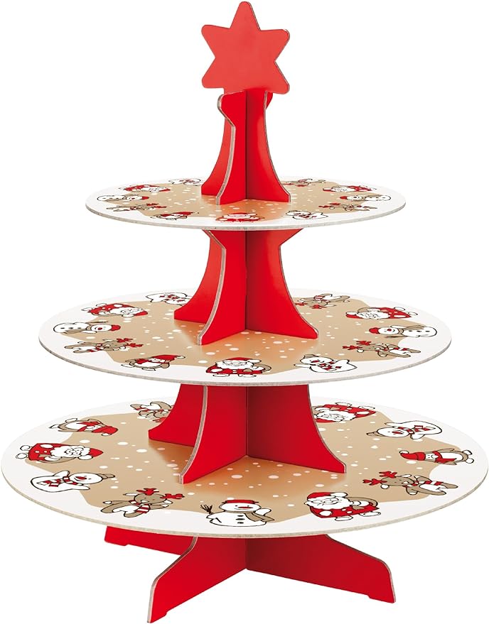 Excelente para servir no estilo de pequenos bolos de Natal. A prateleira é confeccionada em papelão muito resistente, com desenho impresso nas duas faces, resistente à gordura e umidade, montagem simples, possibilidade de uso repetido. Limpar com pano de cozinha seco, não lavar na máquina de lavar louça ou na máquina de lavar louça, não colocar na geladeira, guardar desmontado.